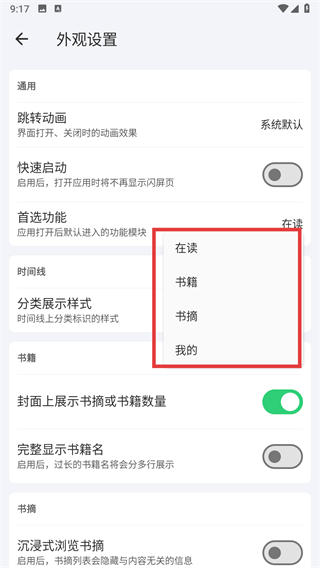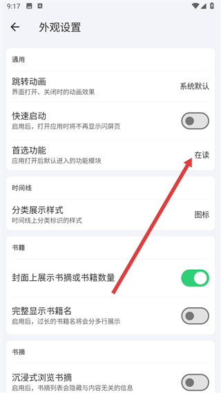 3、在外观设置页面找到首选功能选项,点击其右侧的在读按钮。