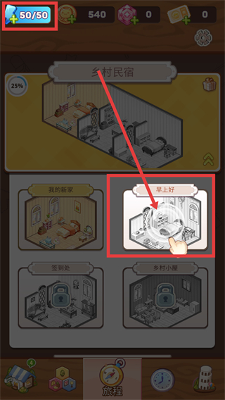 1、在游戏的民宿选择界面,点击标注“早上好”的民宿模块,进入该民宿的装饰编辑页面,开启布置流程啦。