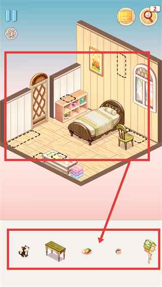 4、根据提示选择下方家具栏里的物品,将其拖动到房间内的对应位置,完成布置后就能解锁新装饰哦。