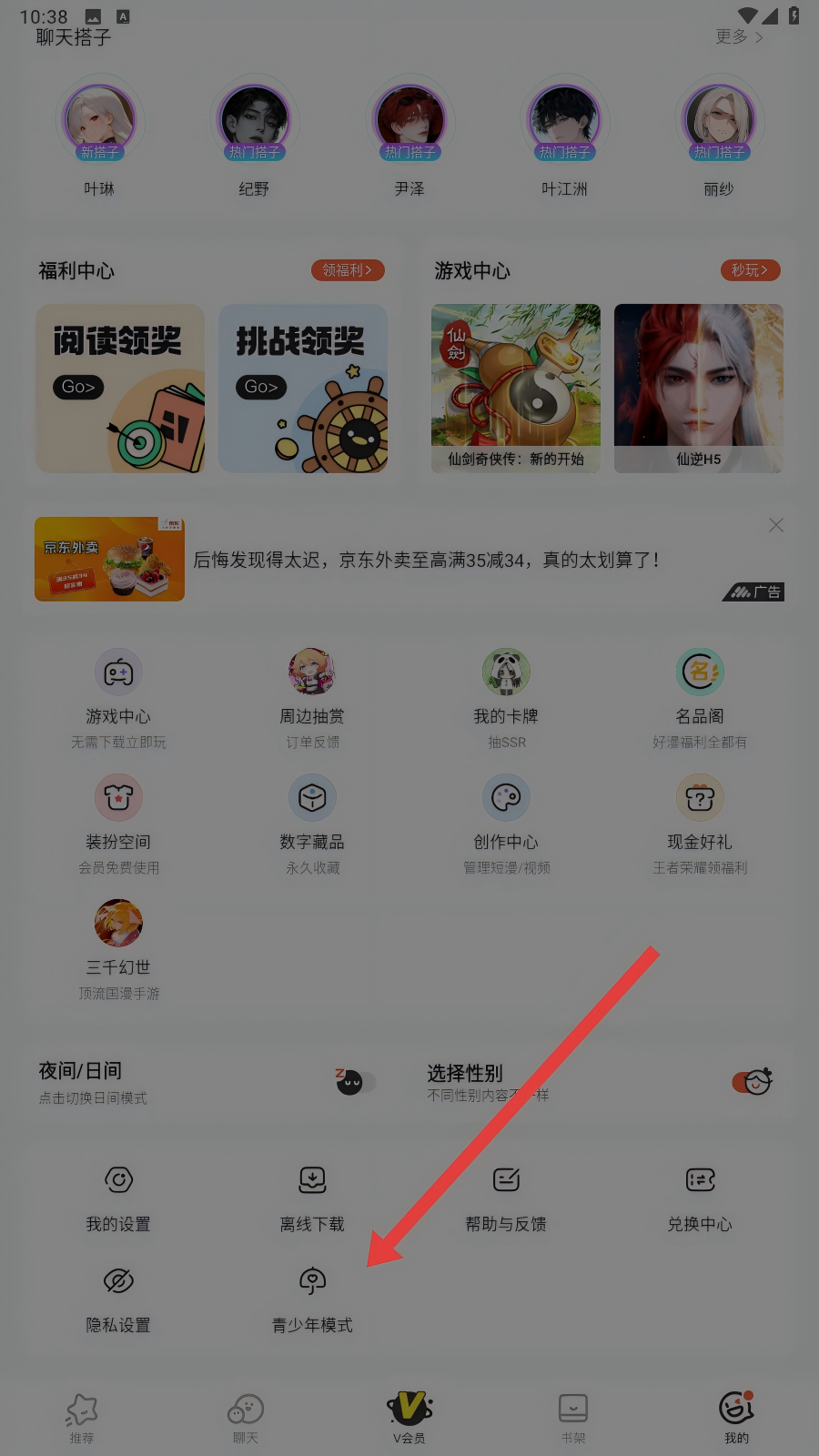 2、在个人界面中,找到【青少年模式】选项并点击,即可进入模式开启流程啦。