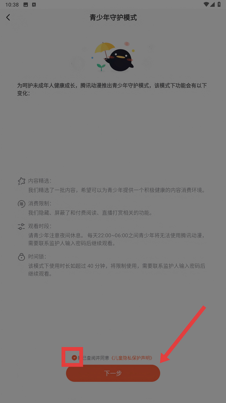 3、进入青少年模式说明页后,勾选【已查阅并同意儿童隐私保护声明】,再点击【下一步】按钮哦。