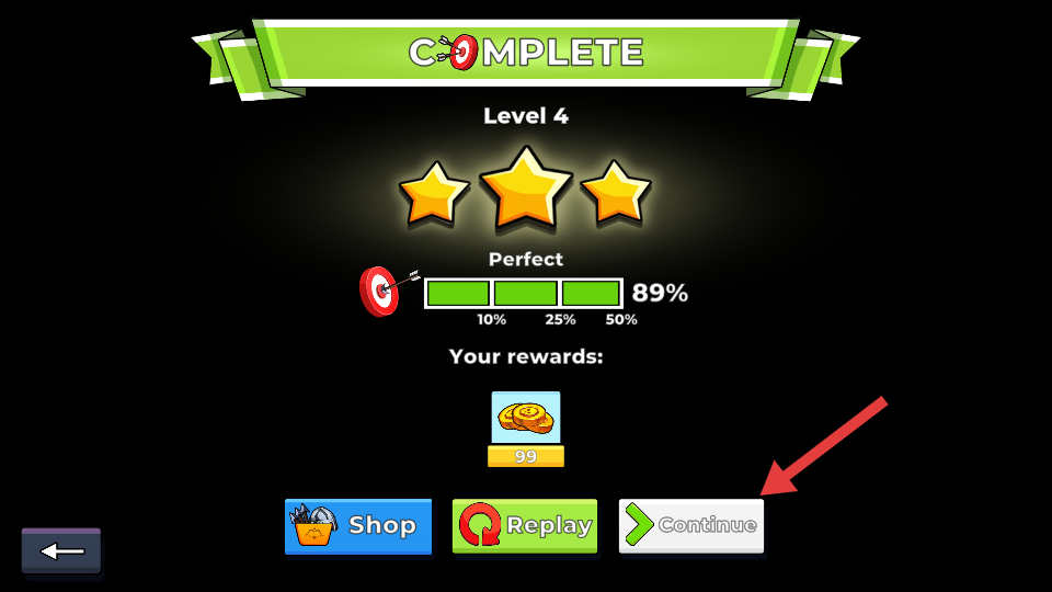 4、完成关卡后,点击【Continue】继续,领取金币奖励,开启下一关挑战。