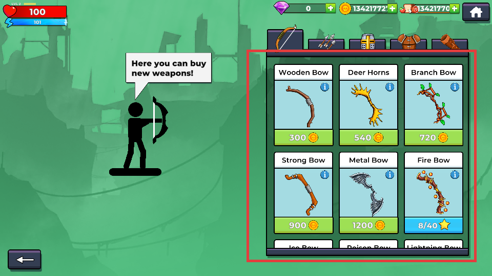 1、在商店可购买弓箭,根据金币选择合适武器,提升攻击能力以便应对更高关卡。