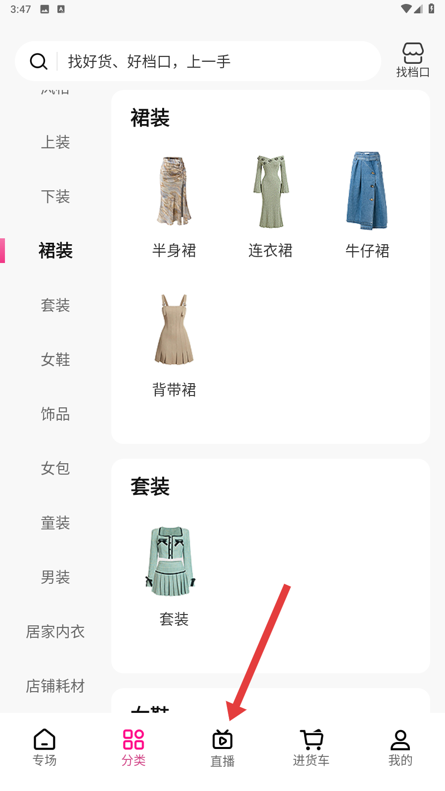 1、打开一手服装批发,点击底部【直播】按钮,进入直播板块,这里服装丰富,可寻觅心仪批发货源哦。