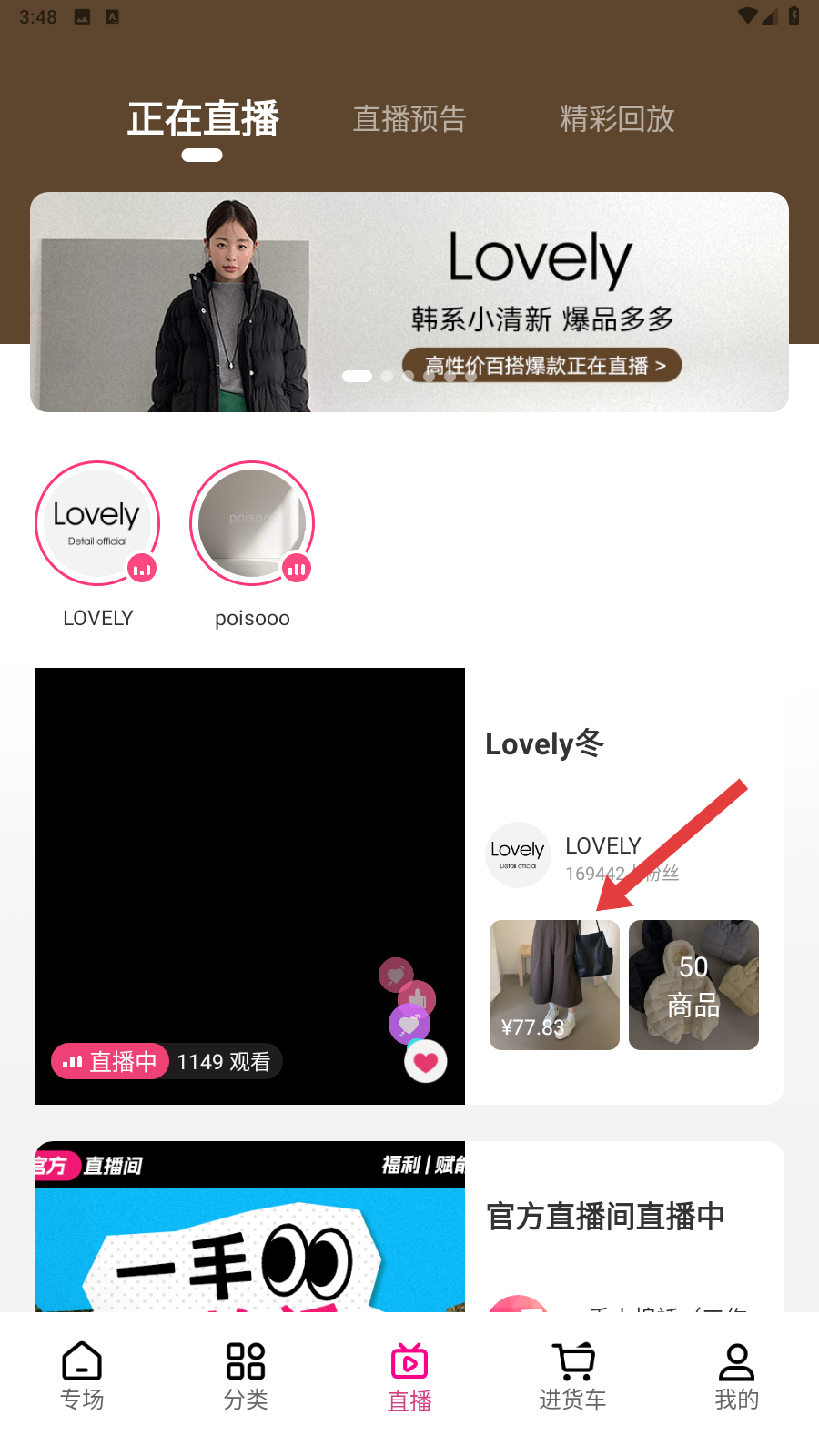 2、在【直播】页面,挑选如【Lovely冬】类的心仪直播间,点击进入。