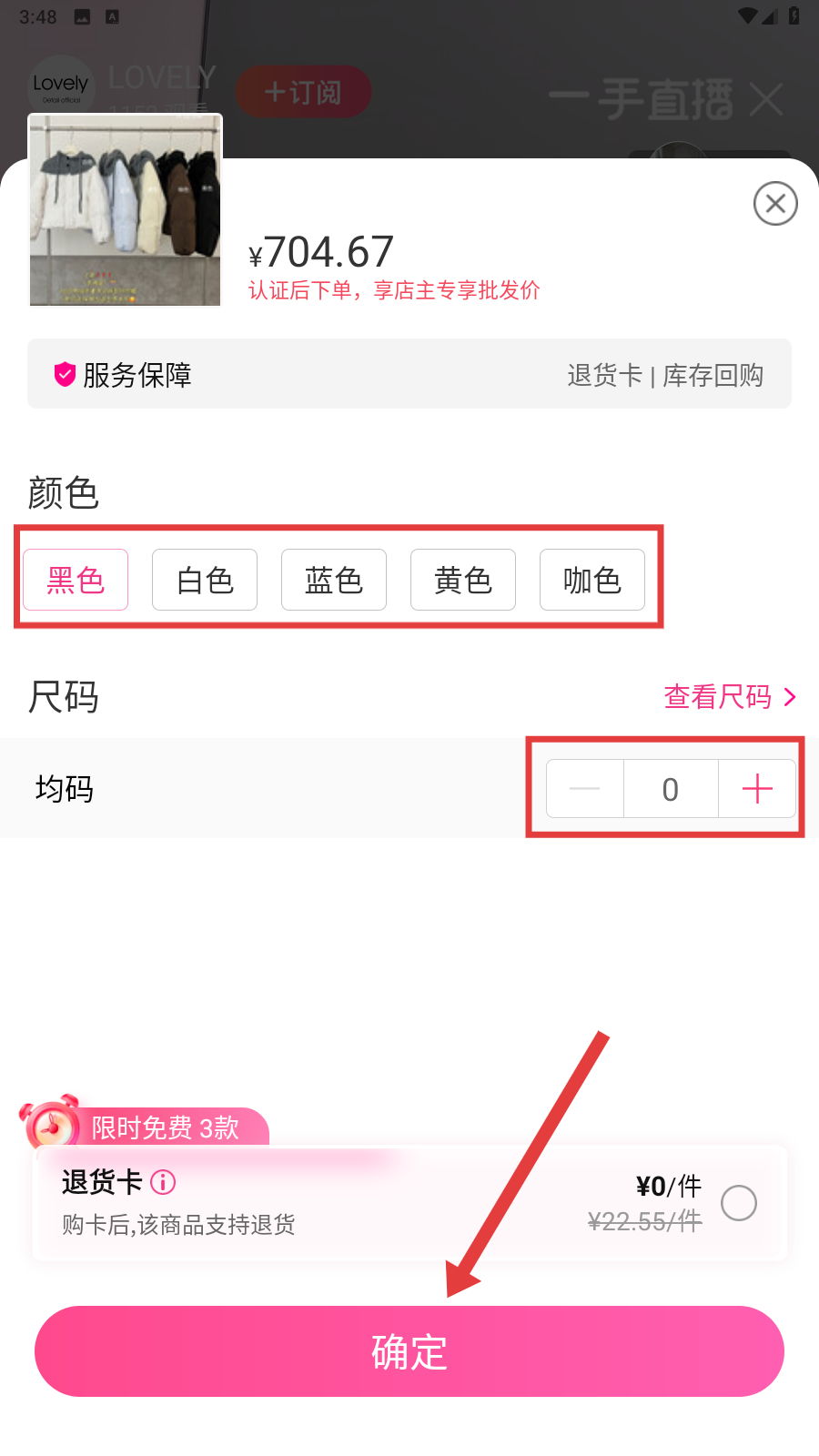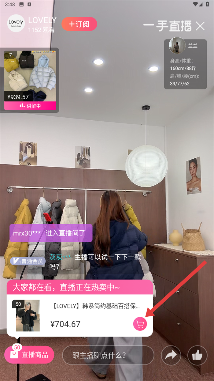 3、进入直播间后,看到喜好商品点击购物车图标,进入商品规格选择界面,准备细致挑选啦。