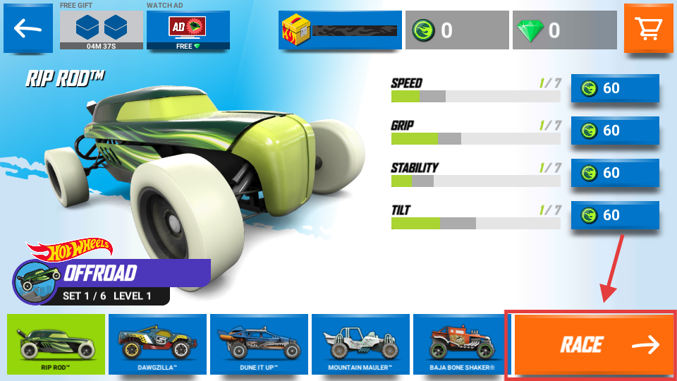 2、在车辆选择界面,可选用【RIP-ROD™】赛车,其初始属性(速度、抓地、稳定、倾斜均为【60】)均衡,点击【RACE】按钮即可开启竞赛,后续可利用无限金币升级车辆。