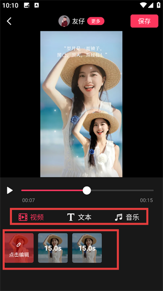 4、进入编辑页,用【视频-文本-音乐】功能调整后保存哟。
