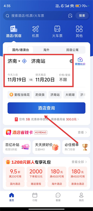 1、打开【艺龙旅行】软件,设置目的地、日期后点【酒店查询】哦。