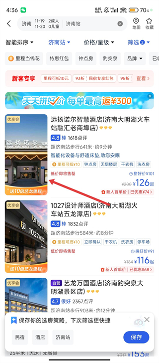 2、在酒店列表里,挑中心仪的酒店点击进入,比如【远扬诺尔智慧酒店】,即可查看房型详情啦。