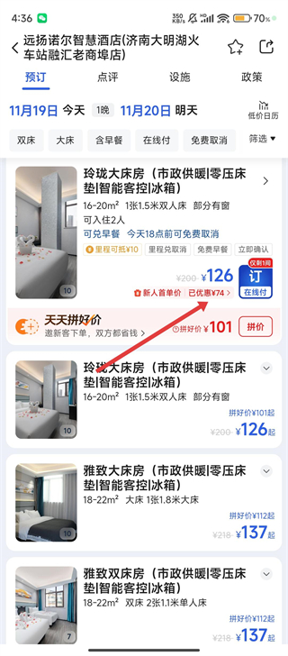 3、进入酒店页,选好房型后点【订-在线付】,进一步确认预订信息,离成功订房更近一步呢。
