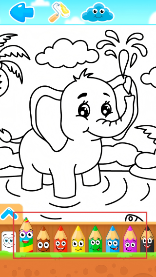 3、选择彩色铅笔,为大象涂色,进行绘画创作,提升游戏进度。