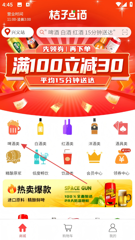 1、在“桔子点酒”商城首页,点击【啤酒类】图标,进入啤酒商品列表页面。