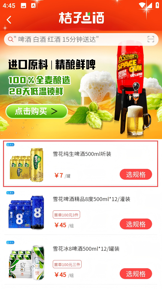 2、在啤酒商品列表页面,找到【雪花纯生啤酒500ml听装】,点击进入该商品详情页。