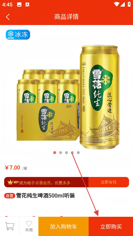 3、在“雪花纯生啤酒500ml听装”商品详情页,点击【立即购买】按钮,进入结算页面。