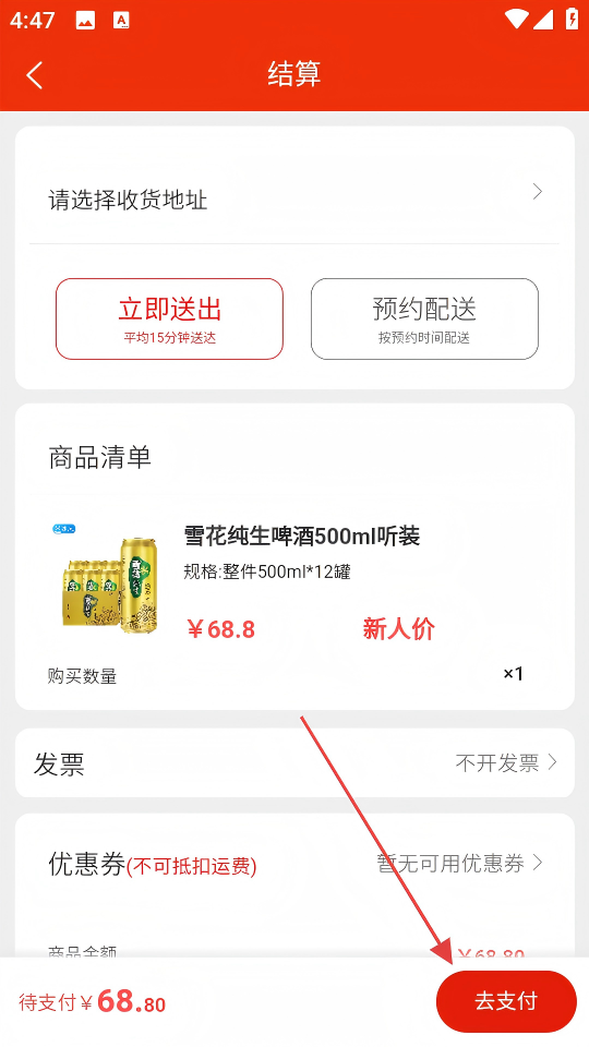 4、在结算页面,选择收货地址、配送方式等信息,点击【去支付】按钮,完成订单支付。