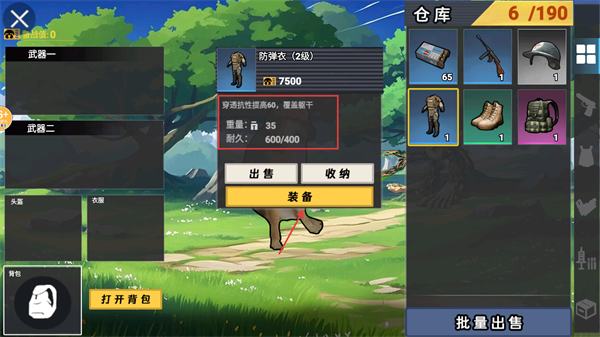 1、仓库中优先装备【防弹衣-2级】,点击装备按钮可提升防护力,增强前期探索生存能力。