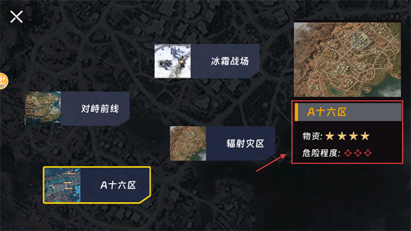2、选择【A十六区】时需注意高危险度,该区域物资丰富适合积累但要做好战斗准备。