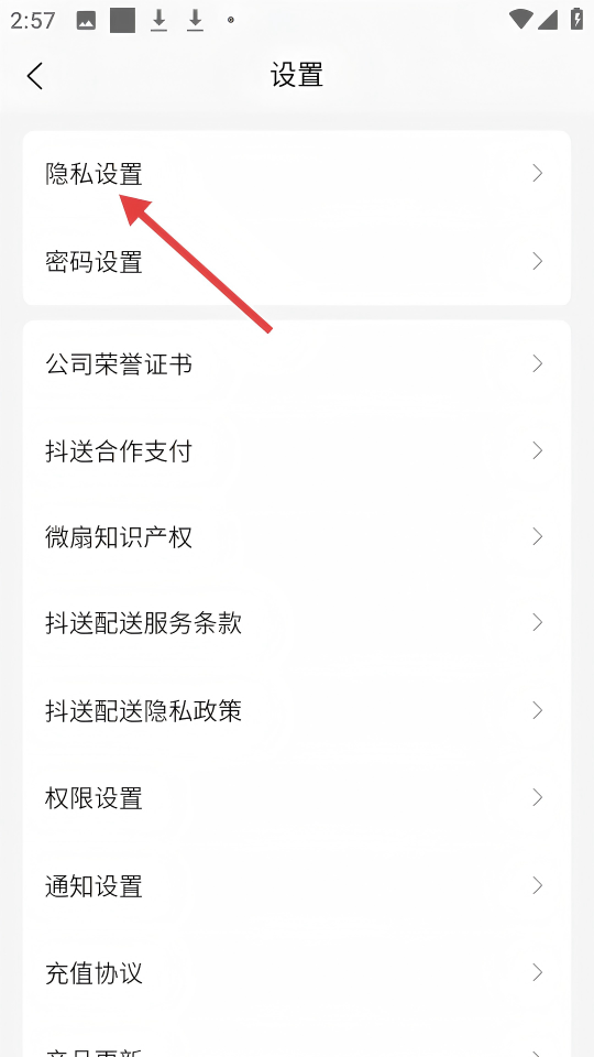 3、在设置页面,点击【隐私设置】选项,可进入隐私设置页面。