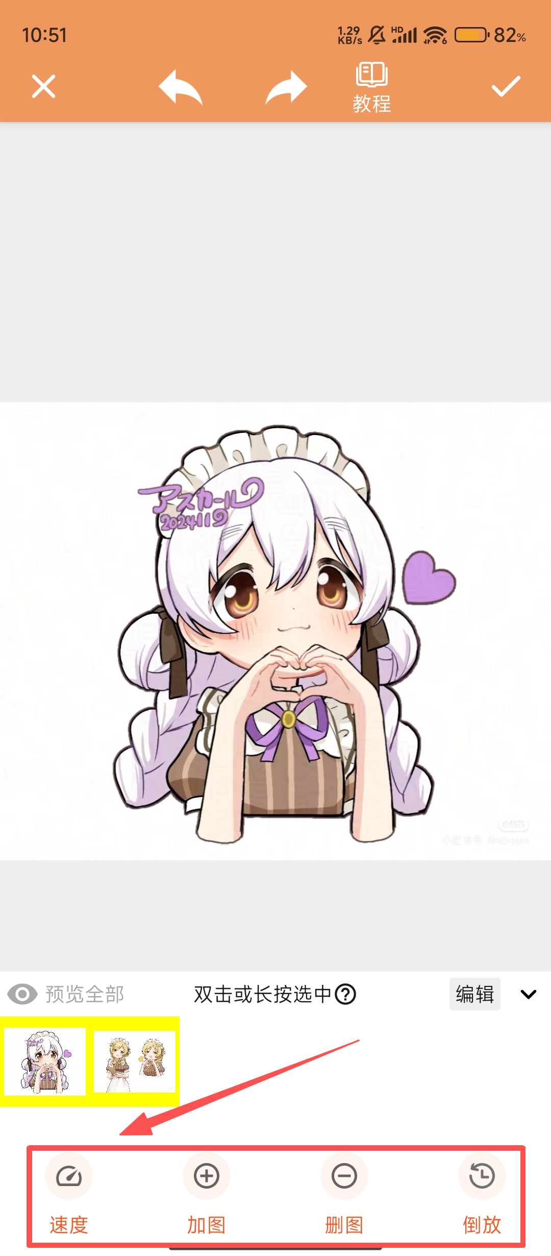 3、在编辑界面,我们可以利用【速度】、【加图】、【删图】等功能,对GIF的内容和效果进行个性化调整哦。