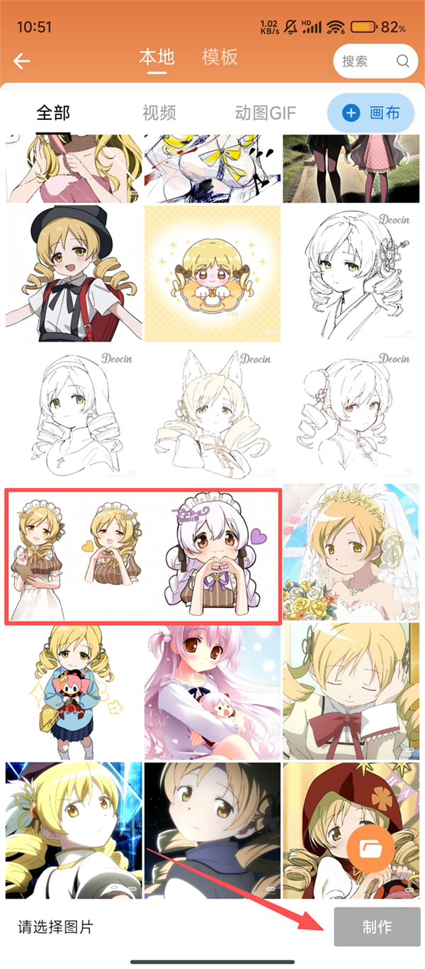 2、在素材选择界面,挑选好想要制作GIF的图片后,点击右下角【制作】按钮,就能进入编辑界面啦。