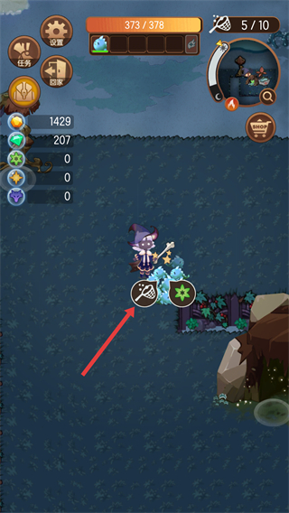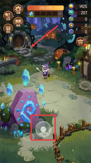 1、在主场景中,通过红色框内的虚拟摇杆控制女巫移动,向红色箭头指向的区域前进。