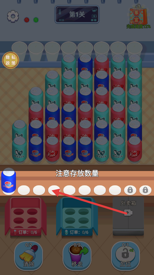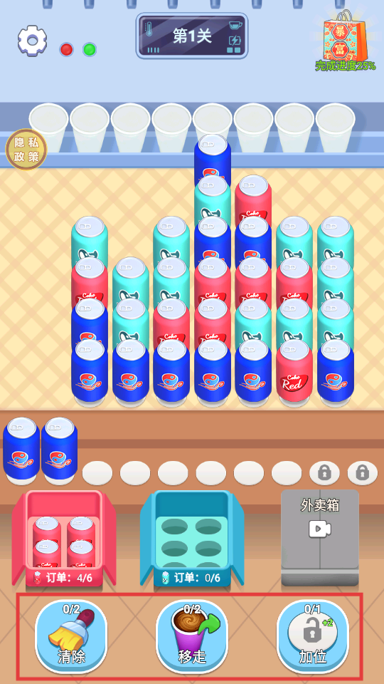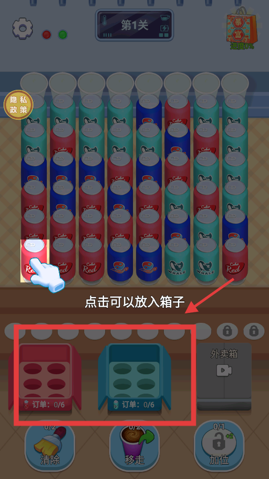1、第1关开始,点击对应颜色的罐子,将其放入下方同色的箱子中,逐步推进订单完成度。