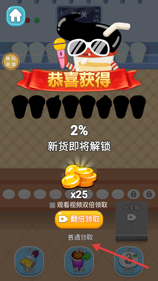 4、关卡完成后,可选择“普通领取”金币,或看视频“翻倍领取”,还能解锁新货,继续挑战。