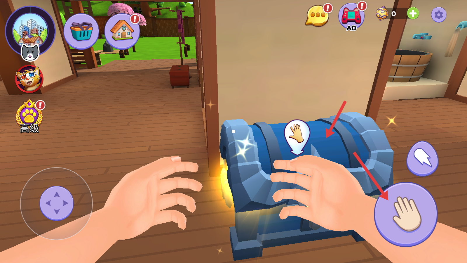 2、点击带手型图标的蓝色物体,使用右下角手型按钮将宝箱打开。