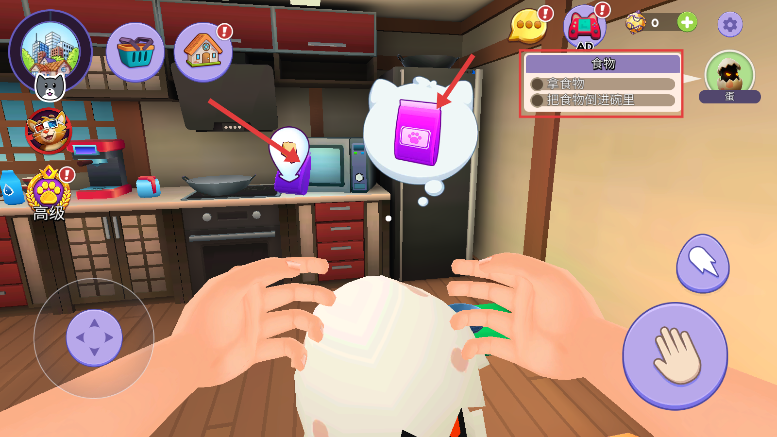 3、按【食物】任务提示,先【拿食物】再【把食物倒进碗里】。