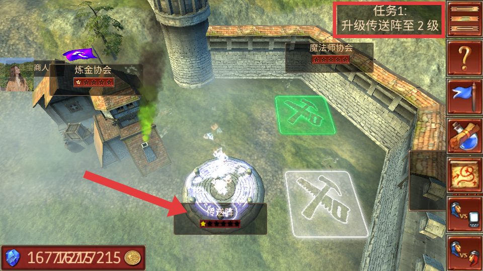 1、进入游戏后,根据方框内任务【升级传送阵至2级】,点击【传送阵】进入升级界面。