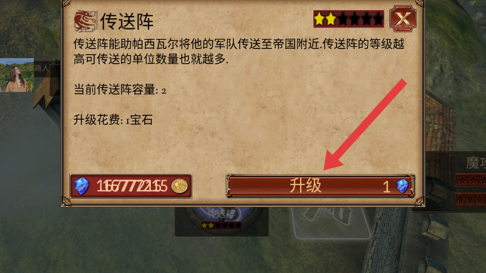 2、在升级界面里,点击【升级】花费1水晶进行升级传送阵。