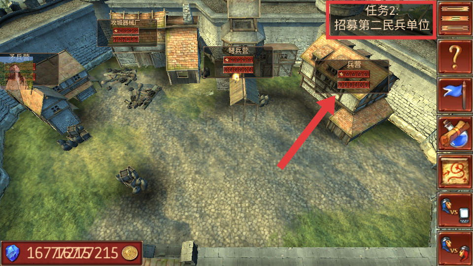 3、将传送阵升级完成后,进入下一个任务【招募第二民兵单位】,点击【兵营】进入招募界面。