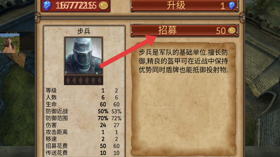 4、在招募界面里,点击【招募】花费50金币将步兵招募至兵营。