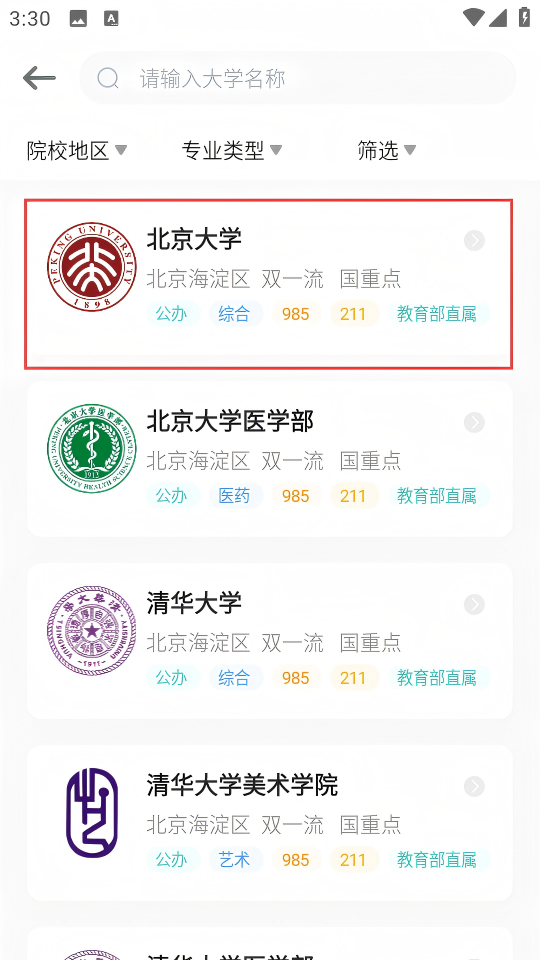 2、在大学列表页面中,选择【北京大学】,点击进入院校详情页面。