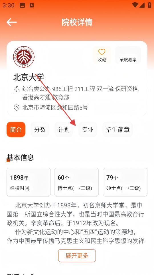 3、在北京大学的院校详情页面,点击【专业】标签,切换到专业信息板块。