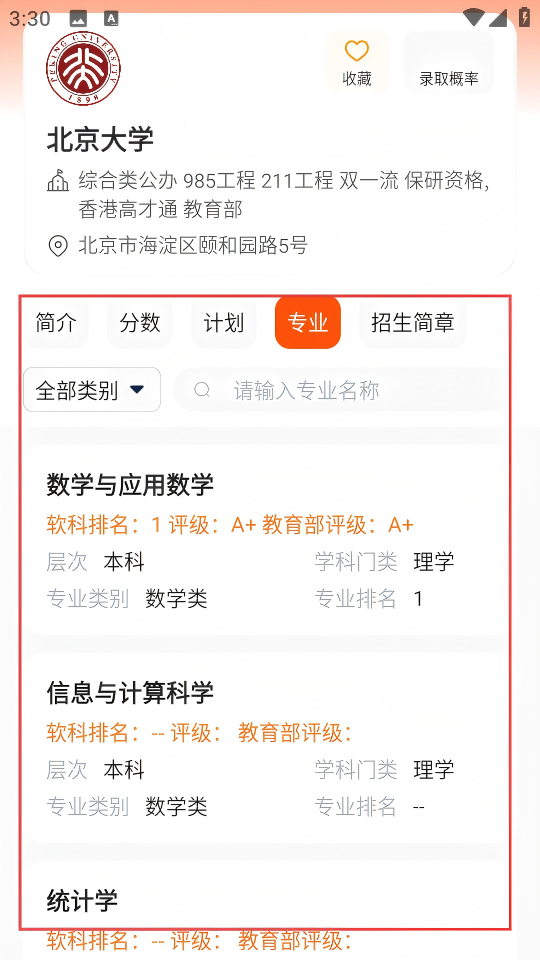 4、进入专业信息板块后,即可查看北京大学的专业信息。