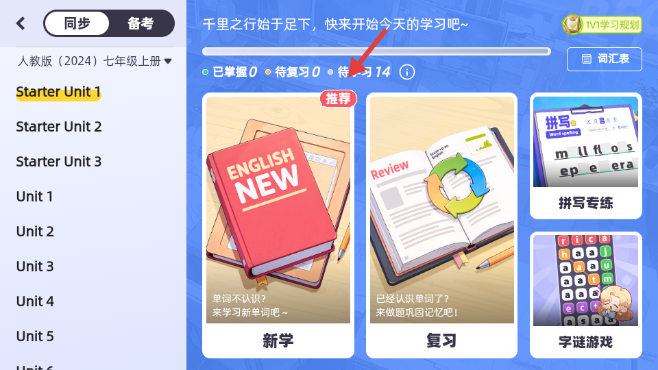 1、选择对应教材章节,点击【新学】开始学习新词汇。
