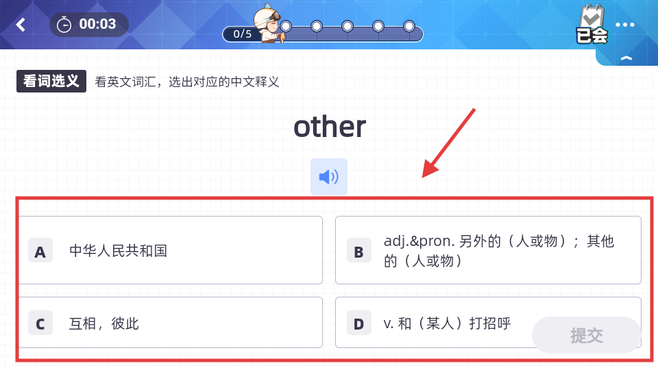3、完成看词选义题目,根据单词选出正确中文释义。