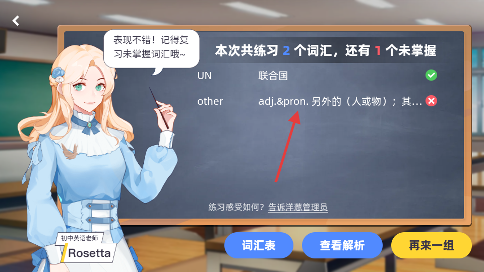 4、查看练习结果,针对未掌握的词汇进行复习。