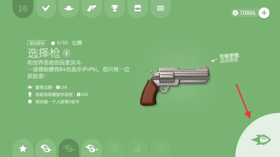 2、选择左轮手枪后,点击右下角箭头开始比赛,参与64人对决,赢取金币与排名奖励。