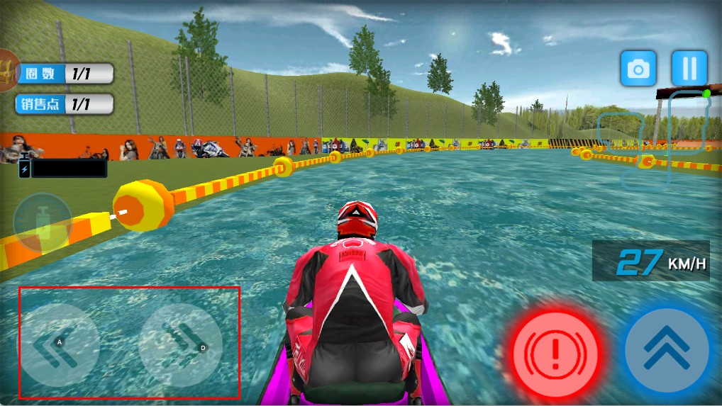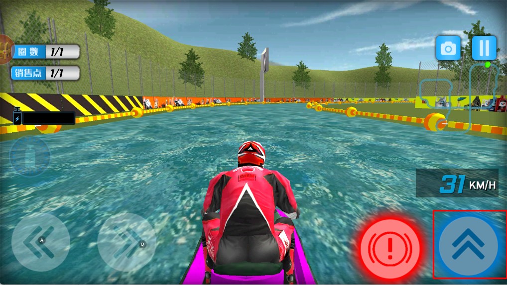 3、通过右侧向上箭头按钮,控制水上摩托加速。