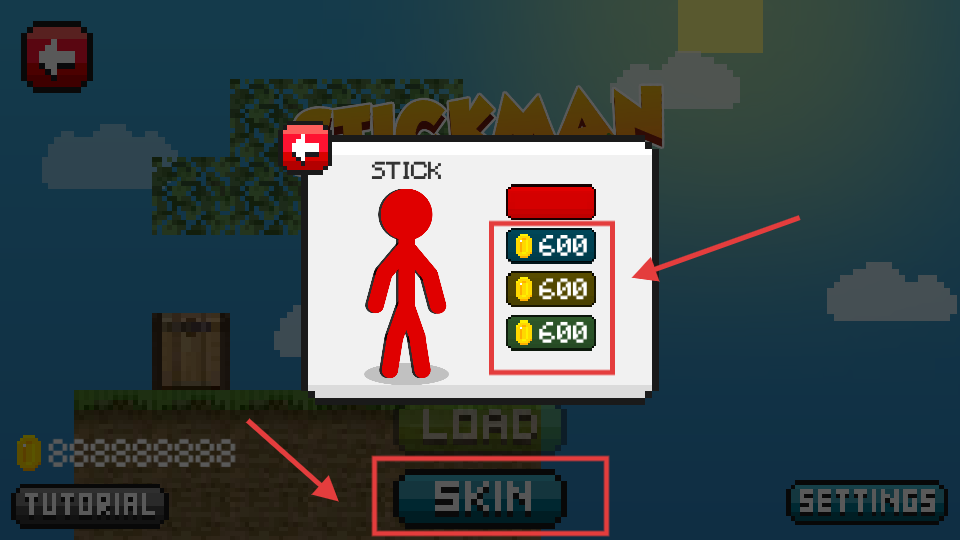 1、初始界面中,点击【SKIN】可进入皮肤设置界面,三种【600】的货币可用于解锁或升级火柴人外观。