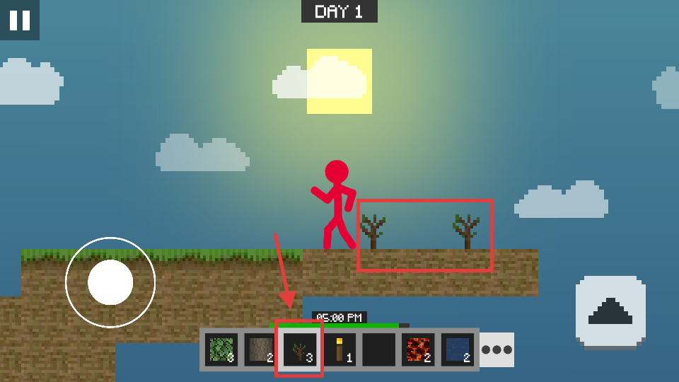 2、游戏开始后,物品栏中选择【3】个树苗,在空地处种植,白天优先种植树木,树木成熟后可获取木材,同时注意时间【DAY-1】【9:00-PM】,提前准备夜晚生存资源。