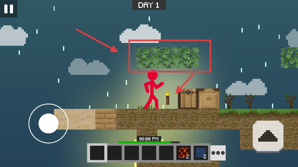 3、下雨时,靠近草丛可采集草类资源,箱子旁的火把能提供照明,夜晚前打开箱子收集物资,利用火把驱散黑暗区域,确保自身安全,避免夜晚危险。