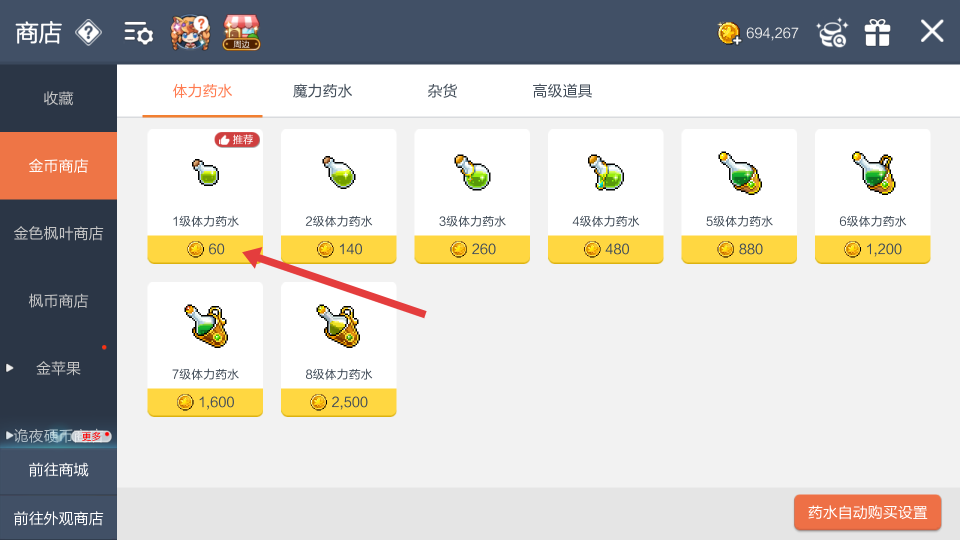 2、在【金币商店-体力药水】栏,买【1级体力药水】,战斗时用来回复,保命必备哦。