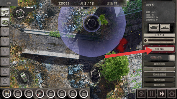 3、点击【升级-50】按钮,提升机关枪的属性,使其拥有更强的火力和防御效果。