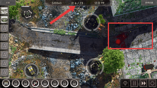 4、持续抵御敌人的进攻,在【波6/15】时仍保持健康值稳定,逐步推进关卡进度。