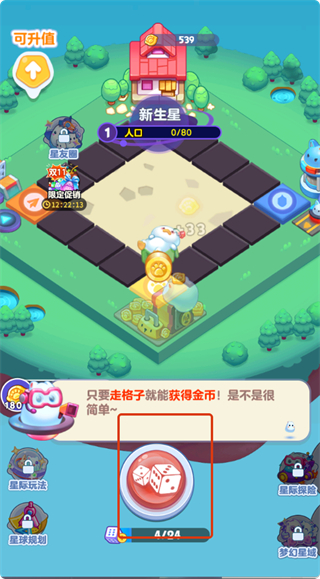 3、在星球经营界面,点击红色骰子按钮,让角色走格子获取金币,积累初始资源。