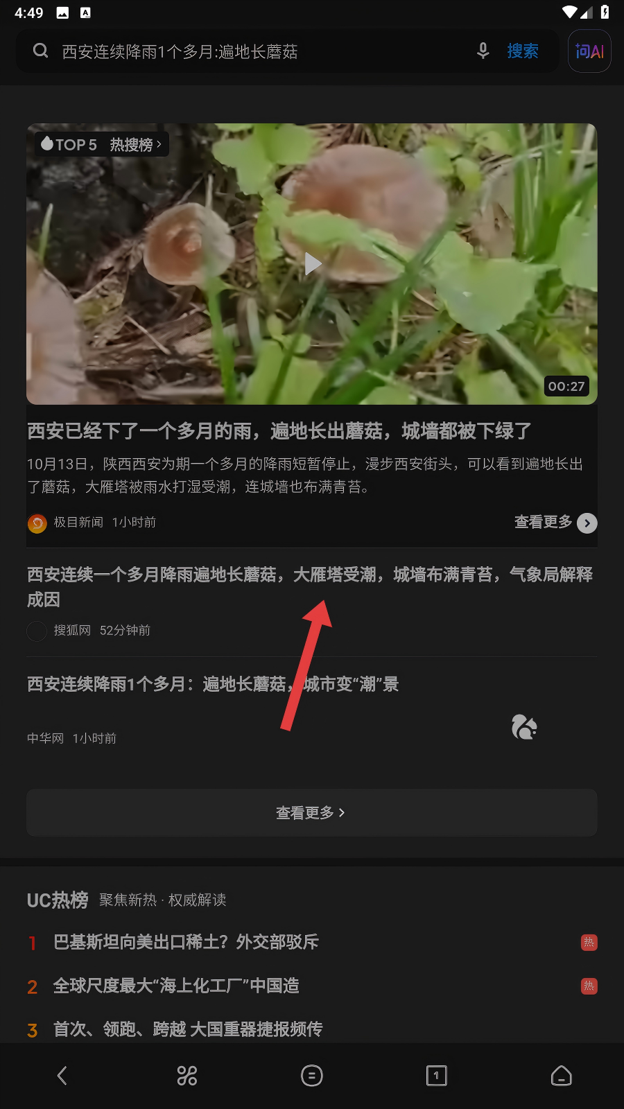 1、在【搜索栏】输入想找的内容,比如【西安连续降雨1个多月-遍地长蘑菇】,再点击【搜索】按钮即可。
